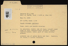 | Description: | Base, neck and handle missing. On shoulder, double row of rays; around upper edge of wall checker-board pattern; below, chariot scene; lower part of body solidly glazed. Liberal use of added white and red. Tendrils in field; a little incision. | |