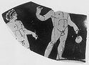 | Description: | Two fragments preserve part of the rim and wall; nothing of the medallion save a single reserved circle. Outside, parts of four figures and of a handle palmette remain; scraped band below scene. Parts of four nude standing youths remain: two carry aryballoi. Fairly careful work; relief contour for profiles, and here and there for flesh outlines. White for hair ornaments, and for the strings of the aryballoi. ADDENDA P 15230 joins this, giving part of the medallion and, on the exterior, a little more of the ground lines. | |