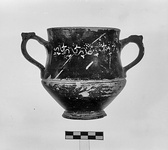 | Description: | One handle and some of rim and body missing. Profiled ring foot, flaring lower wall, high upper wall slightly concave to plain rim. Deep scraped groove at junction of upper and lower wall; scraped groove also around foot. Flat vertical handles with plastic ivy leaf on top. Between handles ivy branches and leaves in yellow and berries in white. Black glaze, rather worn; resting surface reserved. | |