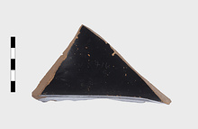Description:   Two fragments from the neck of a large vase: high slightly concave side and flaring rim; neck glazed inside, and around upper part of outside, with two miltos grooves. Glaze band at junction of neck and shoulder.