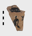 b) Nude youth, left, a jug in his left hand. Uncertain object at edge of fragment, behind him.