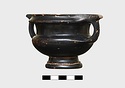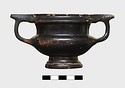 | Description: | One handle and chips missing. Squat type with spurred vertical handles and small doubled rim. Moulded base with miltos groove around outer face and beneath. Rouletting and four stamped palmettes at center of floor. Good black glaze, fired red in part; scraped groove at junction of foot and wall. | |