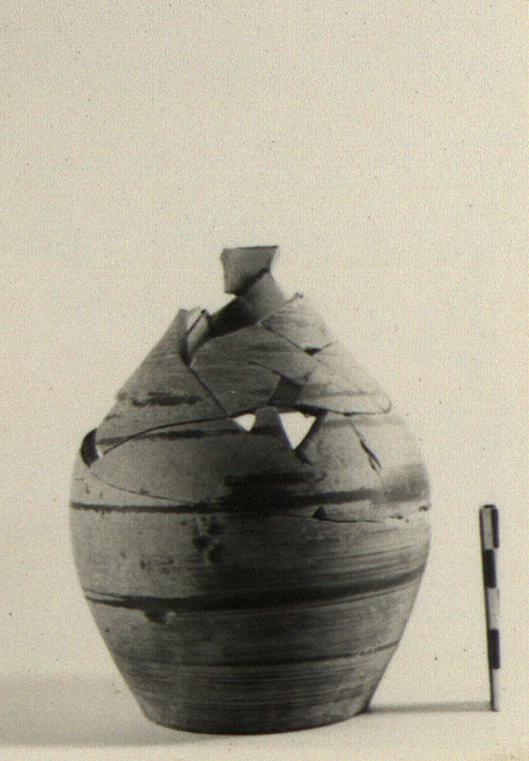 | Description: | Handle, most of neck and lip and part of wall missing; restored in plaster. Small flat-bottomed Subgeometric jug or olpe; short neck, forming continuous curve with shoulder; round mouth. Thin streaky brown wash outside, except on bottom. | |