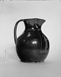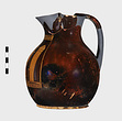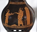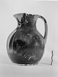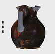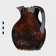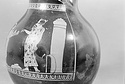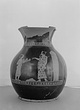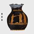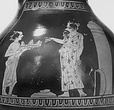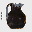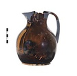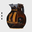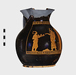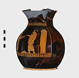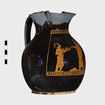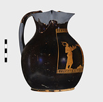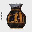 | Description: | The handle missing and nearly all the lip; two small holes in the wall, and one in the floor; the base much chipped. Plump body; low very slightly flaring ring foot. In a panel bordered above and below by egg and dot bands, at the side by narrow reserved lines, stand two male figures, he at the right, facing left, has a heavy almost grotesque face, a high bald forehead and straggling hair and beard; he wears a straight chiton, reaching to his ankles. It falls in loose folds, is decorated with large stars, and tied by a broad girdle at the waist. His left arm hangs at his side; a chip is missing from the hand, which seems, however, to be empty. His right hand is extended toward the second figure, a boy, wearing a cloak knotted around his waist, and carrying a large sacrificial basket. He has a pointed nose, and wildly straggling locks; the front of his head is bald. Behind the bearded figure, at the right of the scene, is a tall smelting furnace seen from the side; it consists of a shaft with a stepped top, and the hooded fire-hole is clearly rendered. On the ground between the two figures is what appears to be a pile of three flat stones, perhaps a simple anvil. No relief contour. Excellent glaze, somewhat mottled with brown; underside unglazed, thin brown wash inside below neck. The whole somewhat darkened, owing to neighboring cesspool. | |