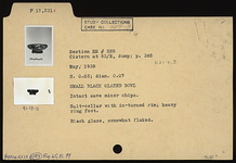 | Description: | Intact save minor chips. Salt cellar with in-turned rim; heavy ring foot. Black glaze, somewhat flaked. | |