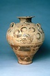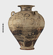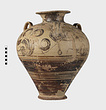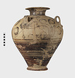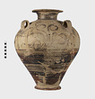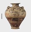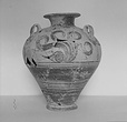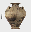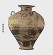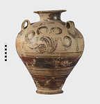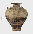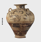| Description: | Mended from many pieces. Small fragments, chips and flakes missing. Flaring lip, flat on top with Z-pattern near inner edge. Neck glazed, with raised ring setting it off from body. Three vertical loop handles on upper part of body, with raised bump projecting below. Each handle at its upper and lower attachment is pierced by a small diagonal hole. The upper half of the body is decorated with elaborate nautilus, plant or octopus-like designs with spirals. The lower half of the body is glazed with groups of horizontal reserved lines. False torus foot. Flat bottom. Buff clay, badly flaked, especially on interior. Glaze dull black to brownish, rather flaked. | |