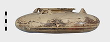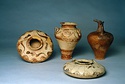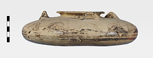 | Description: | Mended from many pieces; a few small fragments and chips of body missing. Round mouth with out-turned lip. Flat, watch-shaped body. Three small handles on broad shoulder or upper half of body; also wave-like decoration and wavy lines. Concentric circles on bottom. Buff clay and slip. Decoration in black glaze which has flaked. | |