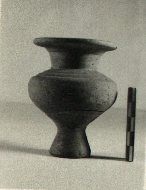 | Description: | Intact. Wide mouth with flat projecting lip, turnip-shaped body and solid conical high stem. Two grooves around shoulder. Sandy buff clay, unglazed, highly micaceous; finer buff slip, much worn. | |