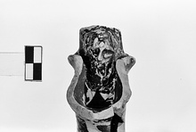 | Description: | Neck fragment of long and narrow-necked oinochoe with trefoil mouth. At handle attachment inside mouth, moulded bearded head. West Slope decoration on shoulder; a little white on hair and beard. Black glaze. | |