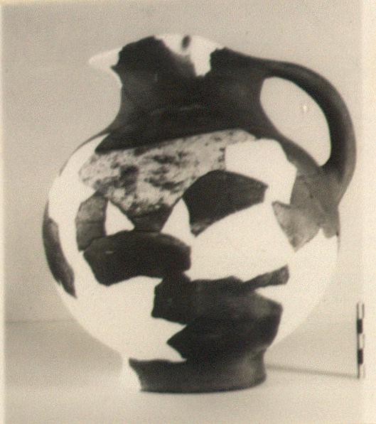 | Description: | Broken all around; fragment from rounded shoulder of closed pot. Around the shoulder, a broad band of added white, bordered at top and bottom by a narrow red band; traces of decoration in red over the white band. Thin gray fabric, apparently not wheelmade. ADDENDA Other fragments added from sherds make up to a plump trefoil oinochoe. Much of body and front of lip missing, but profile complete. High straight ring foot; rolled handle from lip. Gray cooking-ware fabric. The painted band which surrounds the shoulder has a distinctive shape, the point at the center front, rising to just below the lip, the 'strings' tieing the 'headband' beneath the handle. | |