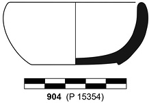 | Description: | Broken but complete except for fragment from rim. Wall gently rounded to plain rim; bottom recessed. Good black glaze; bottom reserved and decorated with central dot and two narrow glaze bands. | |