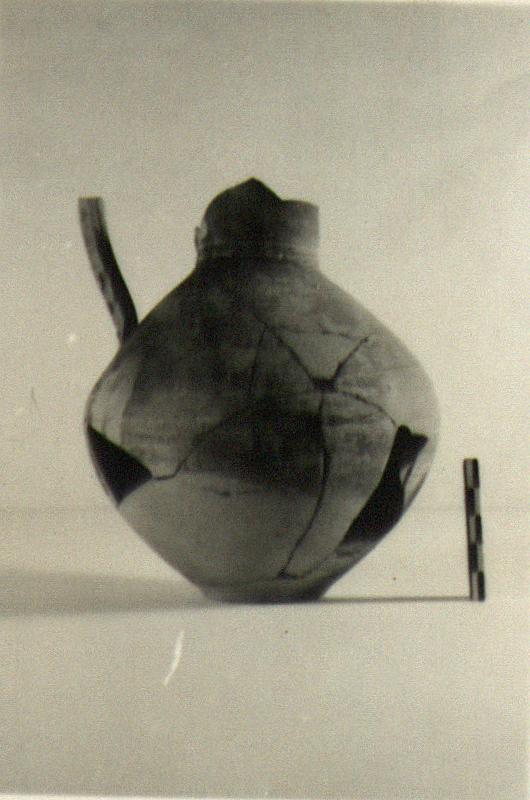 | Description: | Lip and top of handle missing, and small pieces from wall. Flat bottom, plump rounded body, flaring neck with a groove around its base. Ridged handle. Light red to buff clay, buff on surface; outside partly covered with thin brown glaze. Graffito on shoulder: <graphic> | |