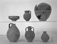 | Description: | Complete except for chips at slot. Squat pear-shaped jug with small raised base, flat beneath, neck narrow; flaring lip; mouth sealed across top but pierced with narrow slot for insertion of coins. Two wheel-run grooves on top and two around shoulder; wheel ridges below. Reddish-buff micaceous clay; unglazed. | |