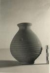 | Description: | Complete except for chips at slot. Squat pear-shaped jug with small raised base, flat beneath, neck narrow; flaring lip; mouth sealed across top but pierced with narrow slot for insertion of coins. Two wheel-run grooves on top and two around shoulder; wheel ridges below. Reddish-buff micaceous clay; unglazed. | |