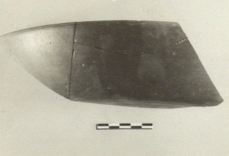 | Description: | Part of wall and floor preserved. High, very slightly flaring wall with plain lip; flat floor with tiny foot ring. Fine reddish-orange clay with white grit. Thin red glaze. Late Roman A. | |