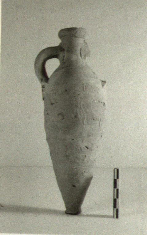 | Description: | One handle missing. Tall pointed body on tiny irregular projecting foot; narrow neck; thick rounded rim. Roundish handles from well down on neck, to shoulder. Heavy coarse fabric of pinkish-orange to buff clay; unglazed. | |