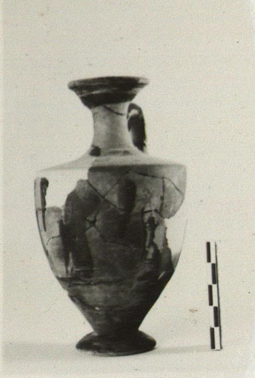 | Description: | Mended from many pieces; fragments of body and shoulder missing; all much burned and worn. Restored in plaster. Shoulder lekythos with spreading foot and flaring lip. Top of foot, lower wall, handle and lip glazed. Palmette between leaves on shoulder; three draped standing figures on wall. Faint traces of added color on drapery. | |