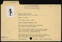 Description:   Lip and neck broken and repaired; one small piece missing. Disk foot; body tapers to slender stem; flat shoulder; tall slightly concave neck with flat projecting lip. Black glaze on top of foot and on stem, for three bands around shoulder-angle; for neck outside, and in part, inside.