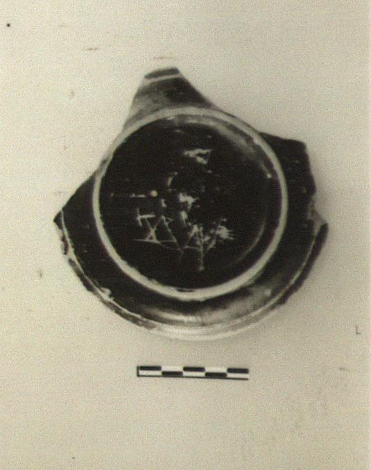 | Description: | A single fragment preserves the foot, with most of the floor, and about one-third of the rim. Ring foot; plain rounded rim; rouletted ring and four stamped palmettes on floor. Incised on bottom: <graphic> Black glaze, worn. | |
