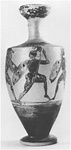 Shoulder lekythos, with disk foot and broad echinus mouth. Glazed on top of foot, lower body, handle and lip. On the shoulder a cock, left, between two large leaves. On the body, combat of three armed warriors. Added red for stripes on cock, fillets around helmets, dots on tunics and on shields.
