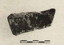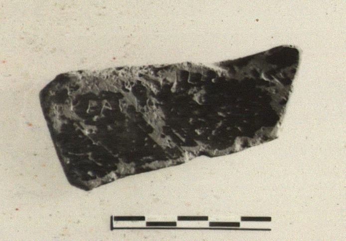 | Description: | From the wall of a semi-glazed krater; thin wash and glaze band outside; black to brown glaze inside, much peeled and pitted. Incised inside along edge: <graphic> | |