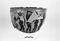 | Description: | Mended from many pieces. Nearly half of the body and the rim is preserved. The foot is entirely missing. Traces of one handle. In center, a nude flute player to right. On either side, two male dancers. The figure on the extreme left is standing right but turning back to touch the horn of a bearded goat below the left handle. Three of the dancers wear sprays of ivy. Red for beards and for the neck of the goat. From left to right the figures wear alternately red fillets and white wreaths. Where a white wreath is worn, a red forelock is the rule. The ivy berries were originally white. Offset lip; reserved line round top of mouth. Good black glaze on interior. | |