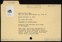 | Description: | Fragment from shoulder with stump of one handle. Decoration in red glaze; narrow horizontal lines, flanked by broad red bands on shoulder; above, traces of a pattern with wavy lines; below, double hooks. Buff clay, buff slip. | |