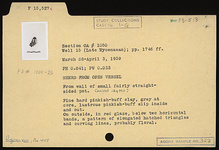 | Description: | From wall of small fairly straight-sided pot. Conical rhyton? On outside, in red glaze, below two horizontal bands, a pattern of elongated hatched triangles and curving lines, probably floral. Fine hard pinkish-buff clay, gray at core, lustrous pinkish-buff slip inside and out. | |
