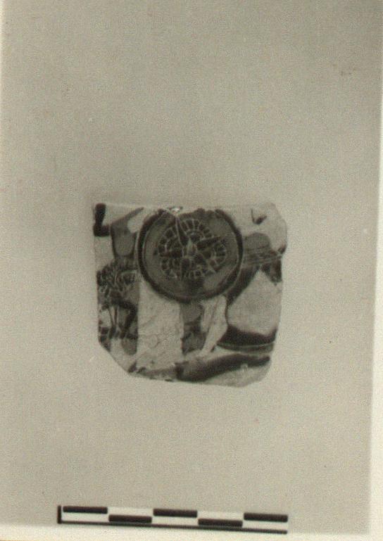 | Description: | Combat scene: at left, head, left shoulder and arm of Herakles wearing lion skin and drawing his sword from its scabbard. Above, to right, an uncertain agglomeration of limbs; in the center a large shield with elaborately incised double rosette as device. Added red, freely used. Cf. CVA Brit.Mus. III Hc, pl. 42. ADDENDA Kyknos? [Jongkees-Vos 1967] | |
