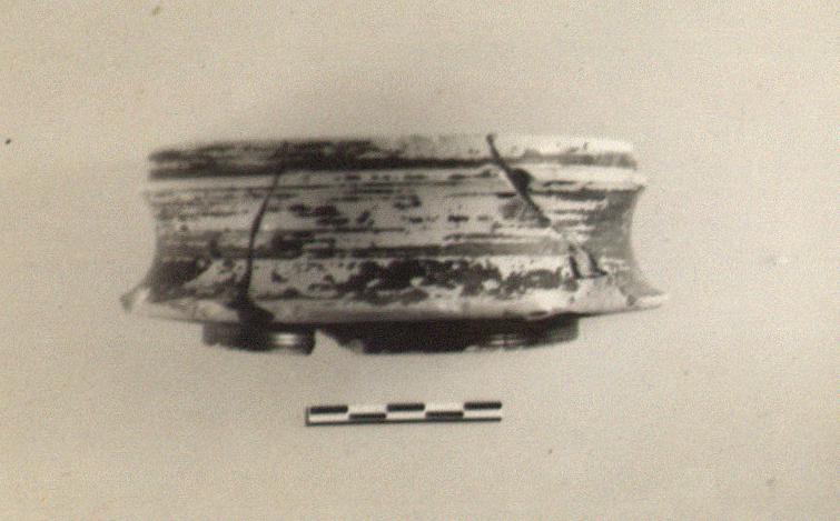 Description:   Mended from several pieces; about half preserved. Concave side wall with rim inset to take lid; broad curving flange at bottom, with moulded ridge underneath it. Ring foot set well in.