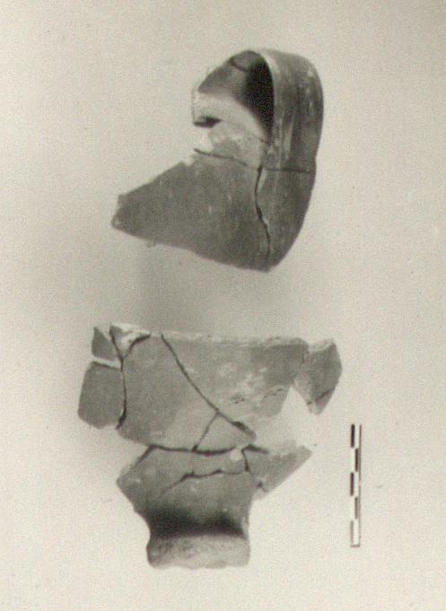 | Description: | Many fragments mend up to two with a tenuous join between them. a) Part of the rim and wall with one handle. b) Preserves part of the floor and wall, the stem and the foot. A deep bowl or cup on a short rather thick stem with disk foot (no edge preserved). Lower wall steep, flaring; more rounded above. Wide short neck-mouth, with slightly out-turned lip. Broad handle from lip. Rather heavy fabric of soft light reddish-brown clay; matte red glaze all over except beneath foot. | |
