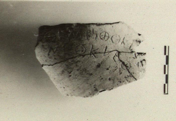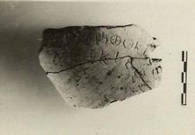 | Description: | Mended from three pieces; fragment from lower wall of an unglazed amphora of brown micaceous clay. Incised outside, diagonally to the pot: <graphic> | |