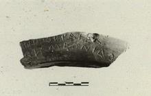 | Description: | Rim of krater with black glaze inside only; rim broad, flat, projecting. Incised on upper face of rim: <graphic> | |