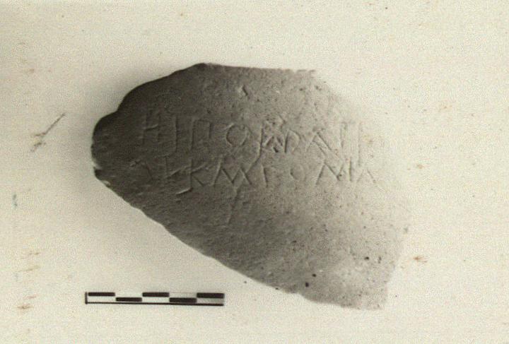 | Description: | From a coarse amphora of micaceous brown clay. Traces of two glazed bands outside. Incised outside: <graphic> | |
