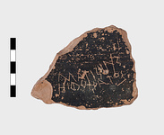 | Description: | Fragment of semi-glazed krater; black glaze inside, chipped; and a reddish-brown band outside. Incised inside: <graphic> | |