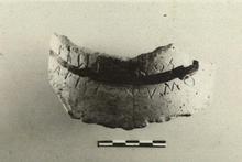 | Description: | Mended from two pieces. Base of neck of unglazed amphora; glaze band at bottom of neck. Incised outside, along junction of neck and shoulder: <graphic> | |