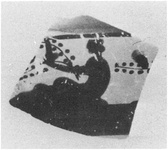 | Description: | Small fragment of offset lip and main frieze preserved, showing woman reclining left holding mirror(?). Reserved band below scene. Summary work. Interior covered with black glaze. | |