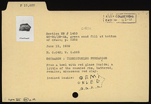 | Description: | From a bowl with red glaze inside; a little of the rounded rim, battered, remains. Incised inside: <graphic> Micaceous red clay. | |