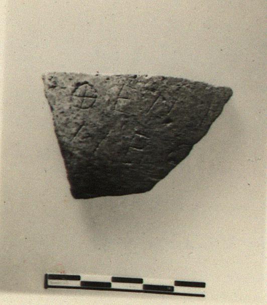 | Description: | From a coarse unglazed pot. Incised outside: <graphic> Micaceous buff to pinkish clay with grits. | |