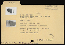 Description:   Fragment of flat roof tile; red glaze on upper face, much peeled.