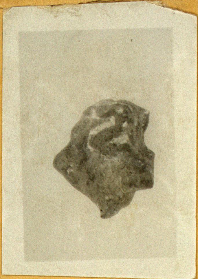 | Description: | Right side of torso, with right arm bent at elbow and holding cloak or scarf which seems to cover head and to spread out in loose wind-blown fold behind figure. Traces of white slip, and of pink and blue paint. Pink clay; remains of black glaze on back of fragment. | |