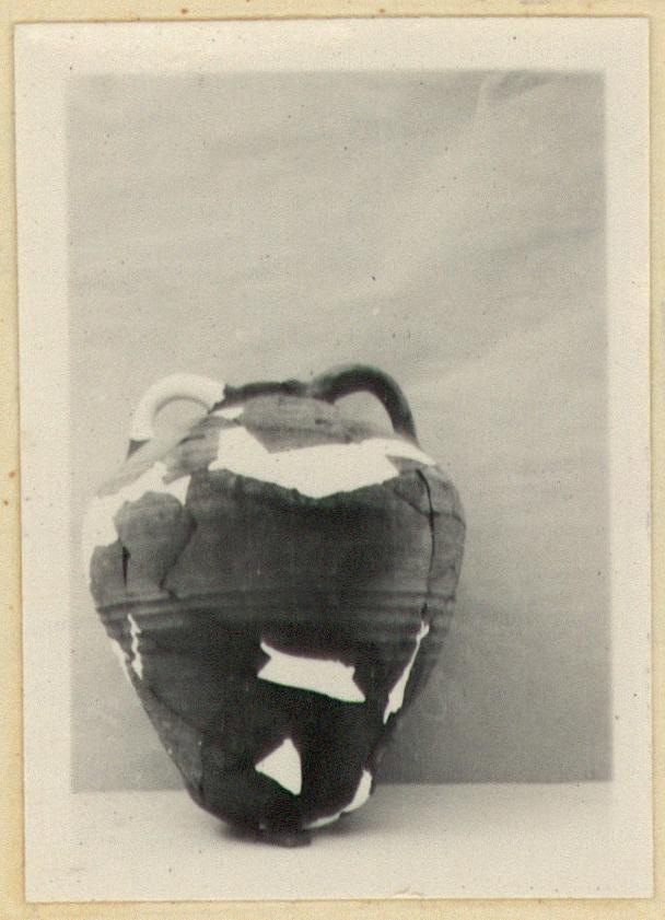 | Description: | Mended from many pieces; one handle and fragments of body missing; restored in plaster. Ring mouth sitting directly on body; no neck. Handles rise above mouth. Fat egg-shaped body tapering below to rounded bottom. Irregular horizontal ribbing, sometimes coarse, sometimes fine. Graffiti on upper part of body; on one side: <graphic> On the other side, written upside down: <graphic> At the root of one handle: <graphic> Buff clay; remains of light buff slip. | |