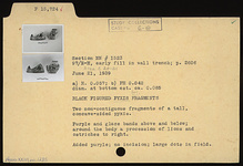 | Description: | Two non joining fragments of a tall, concave-sided pyxis. Purple and glaze bands above and below; around the body a procession of lions and ostriches to right. Added purple; no incision; large dots in field. | |