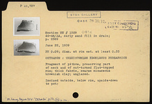 | Description: | Fragment of pithos, preserving part of neck and of out-turned flat-topped rim. Incised outside, below rim, upside-down to pot: <graphic> Thick fabric, coarse micaceous brownish clay; unglazed. | |