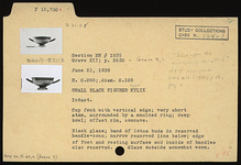 | Description: | Intact. Cup foot with vertical edge; very short stem, surrounded by a moulded ring; deep bowl; offset rim, concave. Black glaze; band of lotus buds in reserved handle zone; narrow reserved line below; edge of foot and resting surface and inside of handles also reserved. Glaze outside somewhat worn. Cf. JHS 52 (1932), p. 56, fig. 1. | |
