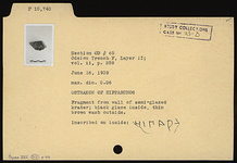 | Description: | Fragment from wall of semi-glazed krater. Inscribed on inside: <graphic> Black glaze inside. Thin brown wash outside. | |