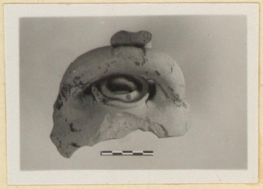 | Description: | Two joining fragments preserve some of top of pot. Narrow mouth with projecting profiled rim. Arching over mouth are two handles at right angles to each other, one circular in section the second, which passes over it, roughly flat. Lantern? Pinkish to buff clay; traçes of red glaze. Cf. P 22861 and P 23085 and P 11204a-d. | |