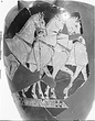 | Description: | Much of the front of the body with the scene preserved; the wall filled out to the shoulder, the foot entirely in plaster, something as P 15840 (ΟΑ 1061) but perhaps too low. Traces of both mastoi preserved on shoulder. For the shape cf. P 15840 and P 15841. Reserved: scraped line at junction of foot and body, above ring; underside of foot. Ornament: maeander band below scene, broken by checkerboard squares at irregular intervals; band not continuous around back of vase; probably no ornament under handle (back of vase not preserved). Figured scene: helmeted female figure (thin Doric chiton girt above the overfold; helmet plume falling to the waist over long curling hair) mounting a chariot drawn by four horses. Before the horses, a youthful male figure (chlamys; sandals laced high) moves right, looking back left toward the team. (Head, shoulders and most of his right side missing). A small non-joining fragment, preserves a bit of maeander and checkboard border with part of some object, probably the toe of this figure's sandalled right foot. Technique: relief contours throughout except for the charioteer's drapery, hair, and helmet crest. Drawing in fine black lines. A little brown shading on the side of the chariot. Hair black to brown; border of chiton black; also harness pole ornament. Horses' eyes filled in with brown around a black pupil; collars brown. Reins black where they cross the necks, but scratched through the glaze where they cross the ground. | |