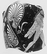 | Description: | Wall fragment from back and one side of vase, with the lower part of the attachment of the triangular handle. Ornament: trace of tongue pattern at shoulder. The base of the handle is outlined with a band of egg pattern. Below and beside the handle, an elaborate palmette and tendril pattern, with acanthus leaves below; at the center an inverted bell. Figured scene: a single figure is preserved, a bearded male, striding right, nude save for cloak over shoulder, petasos, and sandals; (missing: the brows, the brim of the hat, the forearms, the front line of the torso, the left leg below the calf and most of the right foot). The hair, painted in broad black strands over a brown wash, is knotted up at the nape; from this knot escape two long curling tresses, one falling forward over the shoulder, the other hanging down the back. The beard was never painted in. The sandal is elaborately laced to above the ankle; curving out from the back of the leg, at the top of the sandal, is a slender S-shaped projection. Relief contour for petasos, flesh outlines, and for projection from sandal; in the ornament, only for the bell and for the egg pattern. Brown wash for underpainting of hair and on the bell. For the shape, cf. P 15840 and P 15841. | |
