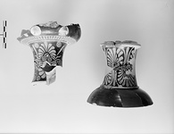 | Description: | Most of the neck, with moulded rib at top and another lighter at base, and most of the wide, circular mouth, like a bowl with flattened lip, preserved, mended from many pieces. Presumably from a vase similar in shape to P 15840 and P 15841. Two shallow wheelrun grooves around the edge of the lip outside and another pair further down. Reserved are the flat top of the lip and a broad band, offset, inside. The ridge at the base of the lip is reserved on its underside; that at the base of the neck is set off by a reserved groove above and below. Ornament: running right around the neck, except at the center back, beneath the handle, a double lotus and palmette band. Relief contour for the lotuses, for the central petals of the palmettes, and for the spirals which connect the two. White dots at the hearts of both lotuses and palmettes. | |